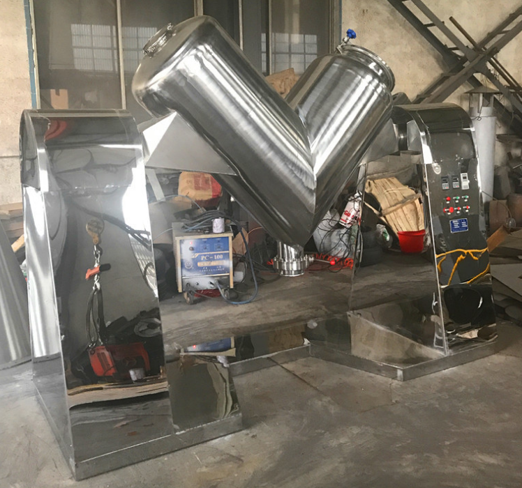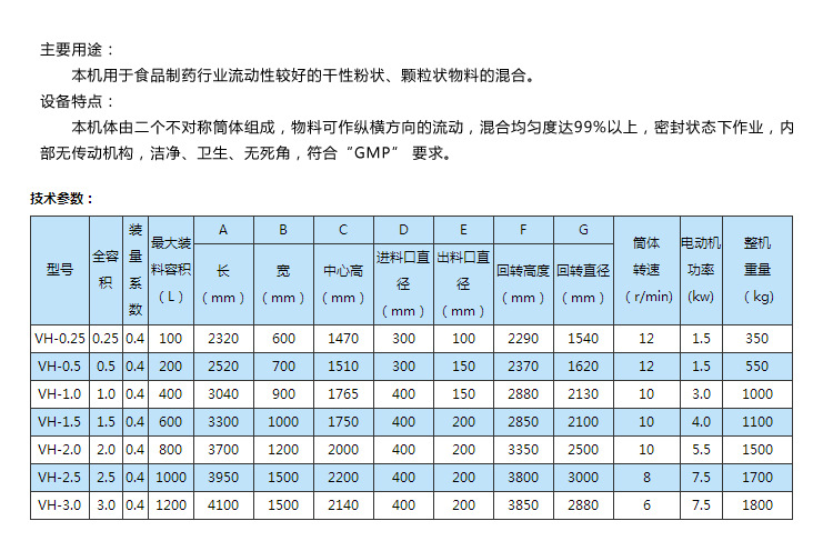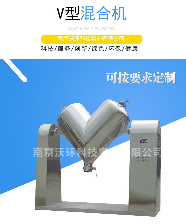 產(chǎn)品概述: 本機(jī)適用于制藥、化工、食品的干粉狀、顆粒裝物料的混合。該機(jī)混料筒結(jié)構(gòu)獨(dú)特,混合均勻,效率高,不積料。整機(jī)結(jié)構(gòu)簡(jiǎn)單,操作容易。外表面和物料接觸部分均采用優(yōu)質(zhì)不銹鋼制造,造型美觀,維護(hù)、清洗方便。 應(yīng)用場(chǎng)景: 本機(jī)用于制藥及其它行業(yè)的粉狀或粒狀物料混合之用。本系列混合機(jī)有高效混合型和普通混合型兩種,高效型混合機(jī)主要對(duì)較細(xì)的粉;?qū)δ骋恢髁虾枯^少的物料均能混合均勻;普通型混合機(jī)主要適用于一般物料或產(chǎn)量較大的企業(yè)使用。筒體光滑無(wú)死角、整機(jī)采用不銹鋼材料制作、且外型美觀等特點(diǎn)。 工作原理: 本機(jī)一端裝有電機(jī)與減速機(jī),電機(jī)功率通過(guò)皮帶傳給減速機(jī),減速機(jī)再通過(guò)聯(lián)國(guó)器傳給V型桶。使V型桶連續(xù)運(yùn)轉(zhuǎn),帶動(dòng)桶內(nèi)物料在桶內(nèi)上、下、左、右進(jìn)行混合。 材質(zhì)及結(jié)構(gòu): 1、 混合機(jī)的筒體采用2.5mm304-2B不銹鋼材料制作,外包采用1.2mm304-2B的不銹鋼材料制作,支架采用5#槽鋼。 2、混合的出料閥選用全不銹鋼精加工而成,并在連接處采用定型硅橡膠材料密封,確保機(jī)器在工作時(shí)的密封效果。 3、混合機(jī)的進(jìn)料口采用選進(jìn)的快開(kāi)結(jié)構(gòu),使用戶在進(jìn)料和清洗時(shí)操作簡(jiǎn)便。 4、混合機(jī)筒體兩側(cè)拼縫處加焊兩塊不銹鋼引板并采用拋光處理,使筒體內(nèi)無(wú)一處死角,確保混合機(jī)在混合、清洗時(shí)能夠達(dá)到理想的效果。 5、混合機(jī)內(nèi)設(shè)有強(qiáng)制攪拌裝置。